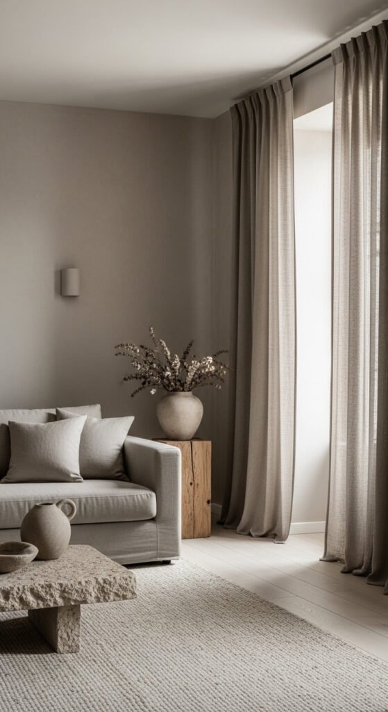 Stone and greige — the warm grey-beige that sits between cool grey and warm beige — is the most commercially dominant neutral monochrome palette and the one found most frequently in new-build homes and professionally staged properties because it works with the widest range of natural light conditions and personal styling preferences. Greige is not a single paint color but a spectrum — warm greige leans toward beige and suits south or west-facing rooms with warm afternoon light. Cool greige leans toward grey and suits north-facing rooms where the warmth prevents the space from reading as cold. Farrow & Ball “Elephant’s Breath” and Dulux “Natural Calico” are two of the most widely specified greige tones in interior design.