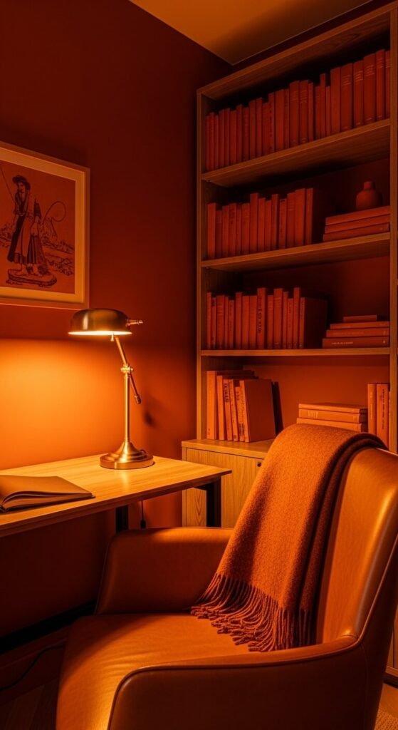 A rust and amber monochrome study creates the warmest and most intellectually focused single-color environment — the amber tones reference candlelight and firelight, two of the historically most productive reading and thinking light sources, and create an atmosphere where concentration and focus feel natural. Select books with rust, amber, and orange-toned spines and group them together on one or two prominent shelves to reinforce the monochrome palette within the book collection itself. Amber leather and rust wool textiles work together naturally without careful matching. A leather desk chair in cognac or amber costs $150 to $400. Warm amber desk lamp light from a simple brass lamp completes the palette at minimal additional cost.