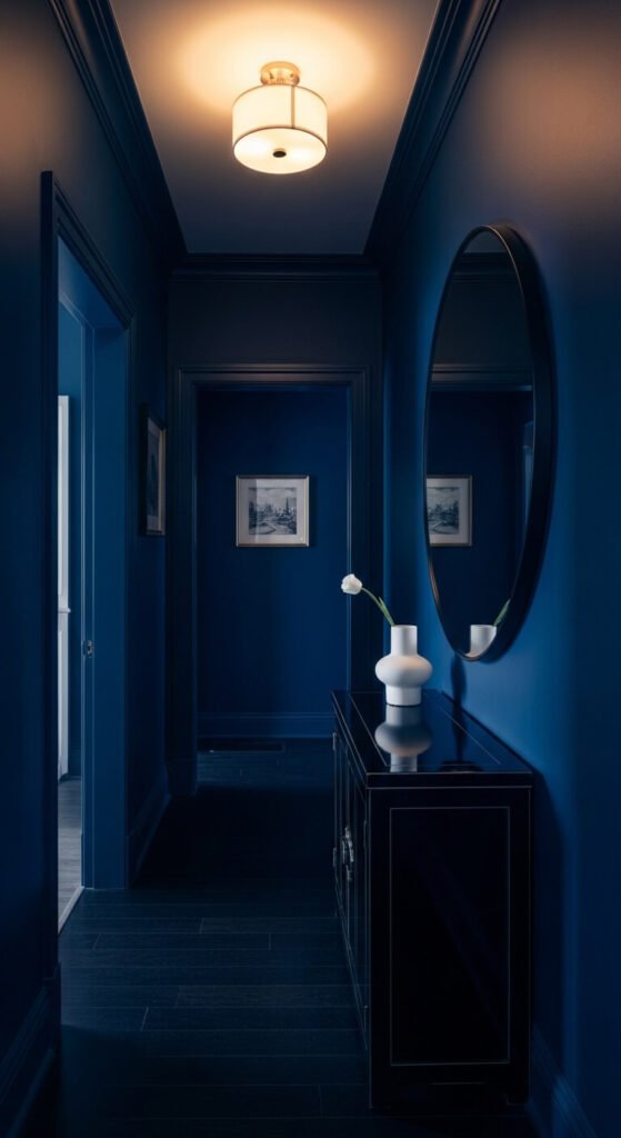 A narrow entry hallway painted entirely in midnight blue — walls, ceiling, woodwork, and all — creates a dramatic transitional passage that signals the character of the home immediately on entry. The enclosed dark blue space feels intentional and confident in a way that a neutrally painted hallway never quite achieves. Painting the ceiling the same color as the walls removes the visual break between the two surfaces and makes the hallway feel like a deliberately enclosed space rather than a corridor between rooms. A single large mirror in a dark frame multiplies the depth of the space. One white ceramic object on the console provides the single visual anchor point. Midnight blue paint costs $25 to $50 for a standard hallway.