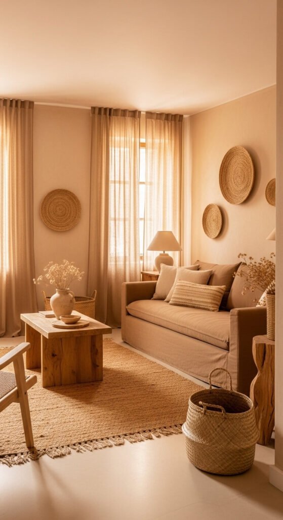 Sand and camel monochrome creates the warmest and most naturally golden single-color interior — the palette of pale sand, warm honey, and deep camel references desert landscapes, natural materials, and the golden tone of afternoon sunlight in a way that looks both worldly and domestically comfortable. Layer natural materials within the camel palette — undyed linen, raw jute, natural rattan, and dried botanicals all exist in the camel-to-sand range and provide organic texture variation without introducing artificial color. Camel and sand soft furnishings from most home retailers cost $30 to $150 per piece. The palette works especially well in rooms with warm natural wood floors that echo the golden tone.