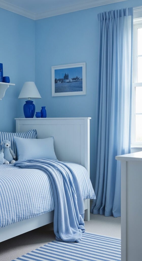 Pale blue is the most calming monochrome choice for a child’s bedroom — significantly calmer than the multicolor primary palettes most commonly associated with children’s spaces, and age-appropriate from infancy through early teenage years without feeling either baby-targeted or overly adult. Keep the range within the pale-to-mid blue spectrum — sky blue walls with cornflower bedding and a pale aqua throw create enough tonal variety without moving toward saturated navy, which reads as a very different atmosphere at child scale. White painted furniture provides a clean neutral backdrop that works at every age stage and makes the blue palette feel lighter. Pale blue paint costs $25 to $50 for a standard bedroom.