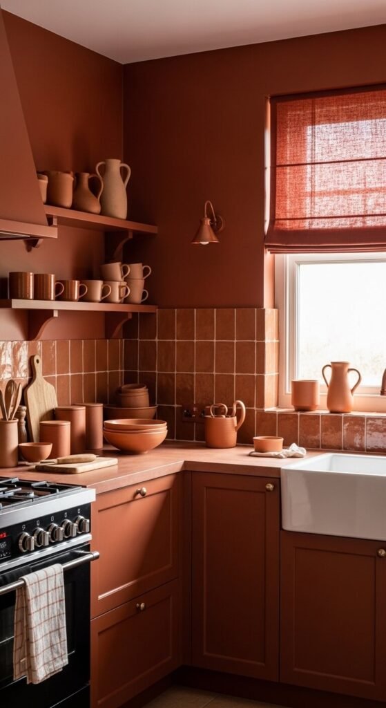 A rust and terracotta monochrome kitchen creates a warm, earthy, and deeply Mediterranean atmosphere that makes cooking feel like an activity in a genuinely beautiful room rather than a utilitarian task in a utilitarian space. Group terracotta ceramics, clay vessels, and rust-toned textiles throughout the kitchen so the monochrome palette is reinforced by every object on every surface — a rust linen blind, terracotta plant pots on the windowsill, clay ceramic storage jars on open shelves, and a rust-toned rug in front of the stove. Terracotta ceramic accessories are widely available and affordable — a set of clay storage jars costs $15 to $40 from most home stores.