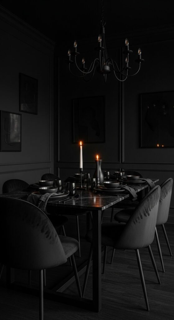 An all-black room is the boldest and most confident monochrome statement — and the one that most surprises people with how warm and enveloping it feels in person rather than cold and oppressive as anticipated. Black works best in rooms used primarily at night — a dining room, a home bar, a bedroom — where the darkness is an asset rather than a detraction from natural light. Matte black walls, velvet upholstery, black lacquer, and black marble all read as different values of black in candlelight and lamp light. A single white candle or a white ceramic provides contrast without breaking the palette. Paint a dining room in matte black for $30 to $50 in paint costs.
