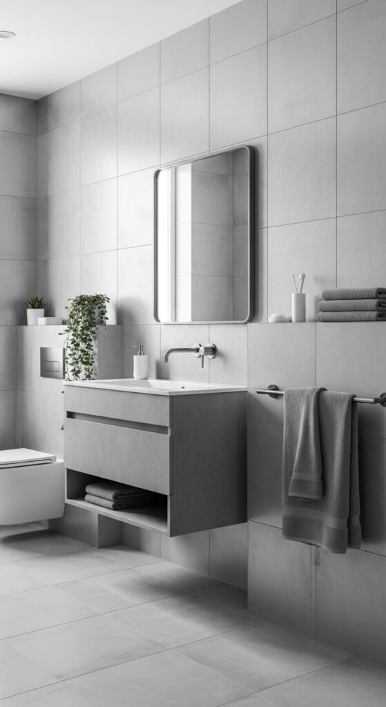 Silver and cool grey creates the most contemporary and most photogenic monochrome bathroom palette — the combination of large-format grey tiles, brushed steel fixtures, and a concrete-look vanity surface creates a bathroom aesthetic that reads as deliberately architectural and premium without requiring significant budget if material choices are made carefully. Large-format pale grey porcelain tiles — available from tile retailers for $2 to $6 per square foot — read as a luxury material at a budget price point because their scale reduces grout lines and creates a cleaner, more expansive visual effect than smaller tiles. Pair with brushed steel fixtures rather than chrome — brushed steel is warmer and more contemporary than the cooler shine of chrome.