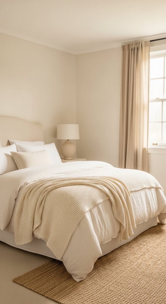 A cream and ivory bedroom is the monochrome approach that produces the most calming, restful atmosphere — because the narrow tonal range removes visual stimulation and allows the room to feel genuinely quiet in a way that color-accented rooms cannot achieve. Layer materials in the cream-to-ivory spectrum with subtle warm and cool shifts — a warm-toned natural jute rug, cool ivory cotton bedding, a golden linen curtain, and a greige waffle throw all exist in the same tonal range while creating visible differences that prevent the room from feeling flat. Cream and ivory soft furnishings from IKEA, H&M Home, and Zara Home are widely available and affordable — a complete cream bedroom from these retailers costs $150 to $400.