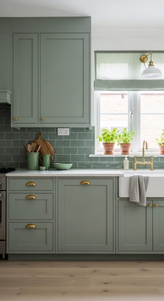 Sage green is the most calming and kitchen-appropriate single-color palette — its grey-green tone references both natural herbs and the muted heritage kitchen colors of traditional country homes, and it has been the dominant kitchen color trend across professional interior design for the past several years. Paint kitchen cabinets in sage green rather than replacing them — a can of chalk or eggshell paint and a foam roller costs $25 to $50 and transforms flat-pack or previously painted cabinets completely. Farrow & Ball “Mizzle,” Little Greene “Sage,” and Valspar’s “Aged Sage” all provide excellent reference tones. Brass hardware on sage green cabinets is the combination that appears most frequently in professionally designed kitchens at every budget level.
