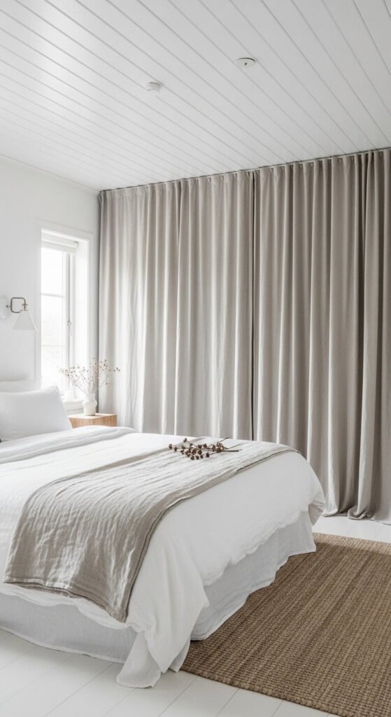 White and natural undyed linen together create a monochrome palette that sits in the warmest and most organic part of the white spectrum — the slight golden tone of natural linen prevents the all-white palette from reading as clinical or cold. Use natural undyed linen for every textile in the room — bedding, curtains, and a throw — and keep all other elements white or raw natural material. The contrast between the crisp white painted walls and the warm, slightly irregular texture of natural linen provides all the visual interest the room requires. IKEA’s natural linen ranges provide the most budget-accessible options — a full set of natural linen bedding costs $40 to $80.