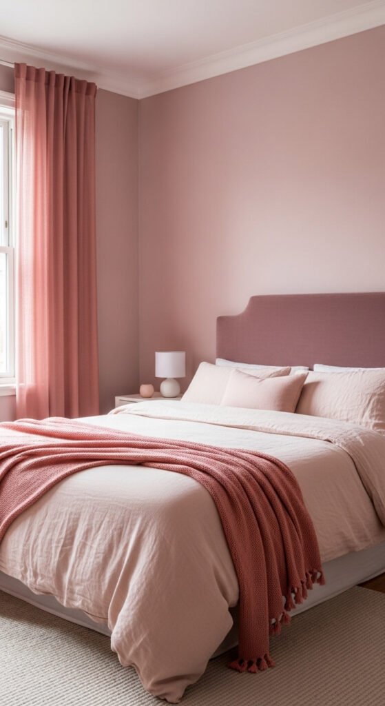A blush pink monochrome bedroom — spanning from the palest barely-pink white to a deep dusty mauve in the same palette — creates one of the most romantic and overtly feminine single-color room approaches available. The key distinction between blush pink rooms that look sophisticated and those that look juvenile is tone — dusty, grey-tinged blush and dusty mauve are adult and considered, while bright or candy pink moves the palette into a very different emotional register. Farrow & Ball “Setting Plaster” and “Sulking Room Pink” are the two most widely referenced dusty pink tones in professional interior design. High-street equivalents are available from most paint retailers.