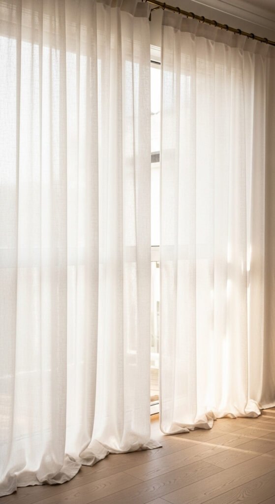 Ikea curtain panels cost $25 per pair. White or natural linen filters light beautifully and works with any decor. Install rods close to the ceiling to make windows look taller. Hang panels wide so they frame the window when open. That’s it. No tiebacks, no sheers-plus-drapes, no decorative hardware. Simple window treatments make rooms feel larger and brighter. They’re easier to clean—just throw them in the wash. This small change has major visual impact.