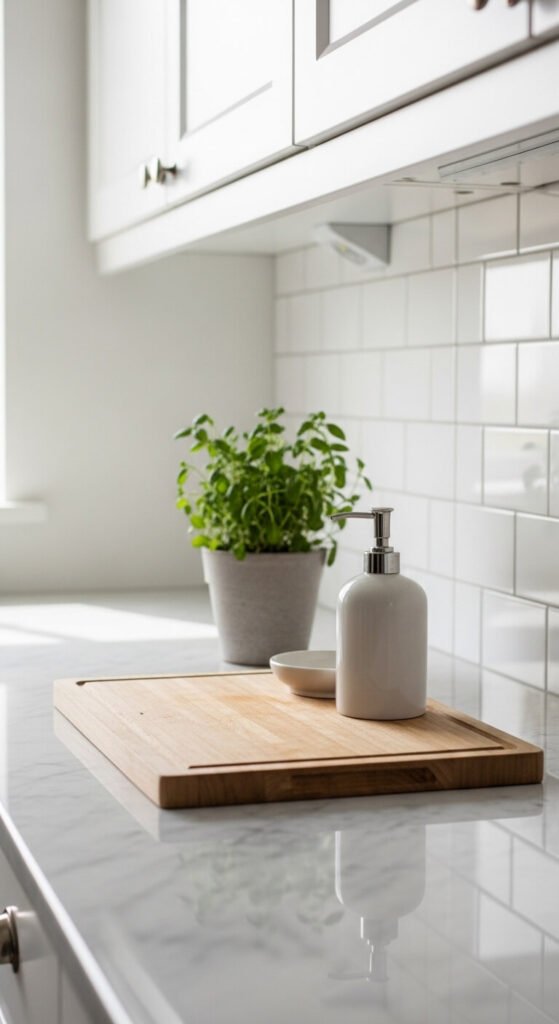 When counters stay clear, cooking and cleaning get easier. You’re not moving clutter to wipe down surfaces. Mornings feel calmer. Use drawer dividers (DIY with cardboard boxes) to organize what goes inside cabinets. Store your coffee maker if you only use it mornings. Keep one small soap dispenser out, nothing else. The visual spaciousness reduces stress. Even tiny counters feel generous when they’re empty. This single habit creates the minimalist look people pay designers thousands to achieve.