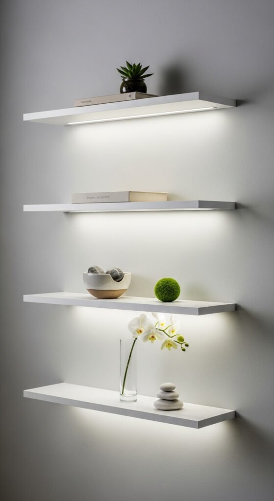 Mount shelves in the kitchen for daily dishes. In the bathroom for towels and toiletries. Above your desk for supplies. Keep what you display minimal—the shelf itself is part of the design. Paint shelves the same color as walls for a seamless look. Or choose natural wood for warmth. The key is restraint. Don’t pack shelves full. Leave space between items. Floating shelves work in any room and instantly modernize your space while adding practical storage.