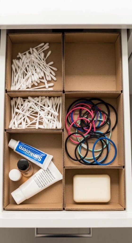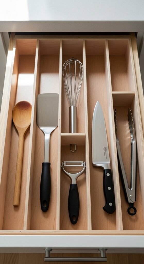 Dividers turn junk drawers into organized systems. Use them in every drawer—kitchen, bathroom, bedroom, desk. DIY versions cost nothing.