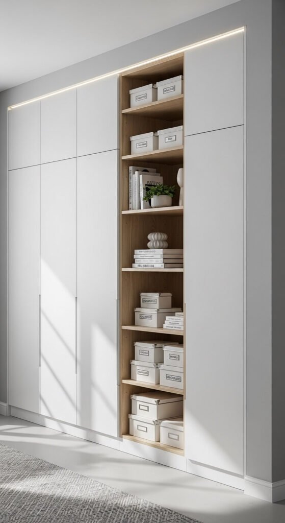 Use wall height, not floor space. Install tall cabinets and shelves that go up, not out. This keeps floors clear and makes rooms feel larger.