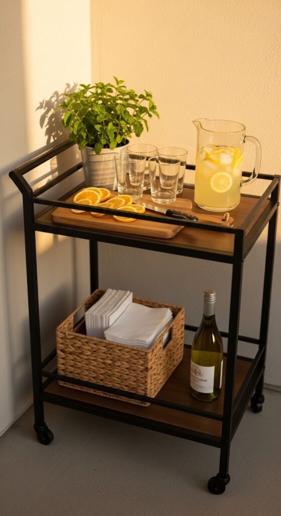 An outdoor bar cart or beverage station removes the constant back-and-forth between kitchen and patio that breaks up outdoor gatherings. A powder-coated metal bar cart rated for outdoor use costs $50 to $90 at HomeGoods or Amazon. Stock the top shelf with a pitcher, glasses, and a small cutting board. Use the lower shelf for napkins, a bottle opener, and backup supplies. Keep a small potted herb — mint or rosemary — on the top corner as a functional garnish and a decorative touch. The cart becomes an anchor point that makes guests feel comfortable helping themselves without disrupting the host.
