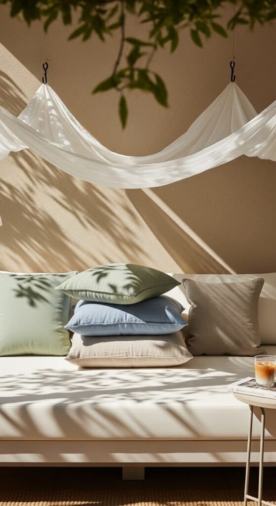 Layered outdoor throw pillows in a tight color palette are what separate a styled patio from a furniture showroom floor. Choose one dominant color, one accent, and one neutral. Mix sizes — two large back pillows, two medium pillows, and one small lumbar in front. Mix one solid with one pattern and one stripe for visual variety without chaos. Outdoor pillow covers cost $8 to $18 each at Target and Amazon. Buy an extra set so you can rotate when the main set gets dirty. Pillow inserts in outdoor-rated foam last longer than indoor inserts when exposed to humidity and the occasional rain shower.