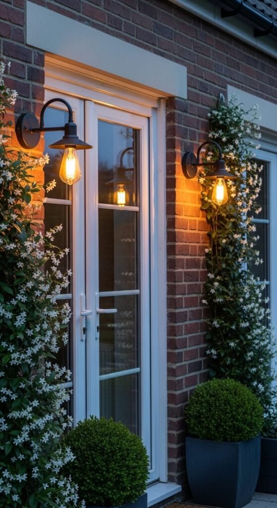 Wall-mounted outdoor sconces provide focused, warm lighting at eye level that overhead string lights alone can’t replicate. They illuminate the patio wall, frame a doorway, and make the transition between indoors and outdoors feel intentional and finished. Hardwired outdoor sconces cost $30 to $80 at home improvement stores and require a licensed electrician to install. Solar-powered wall sconces — no wiring required — cost $20 to $40 per pair and have improved dramatically in brightness. Mount two sconces symmetrically on either side of the main patio entry door for a balanced, architectural look that photographs beautifully and functions practically every evening.