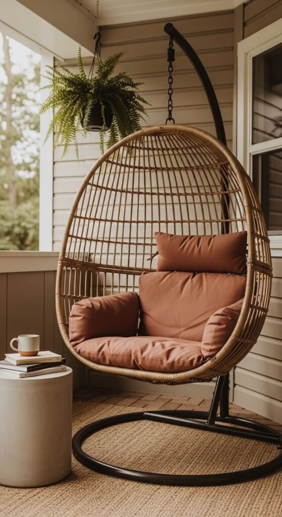 A hanging egg chair in a patio corner creates the most popular seat on any patio — it’s a guaranteed conversation piece that everyone wants to try the moment they see it. Woven rattan hanging egg chairs cost $150 to $350 and mount from a ceiling bracket rated for 300 or more pounds. Attach only to a solid structural ceiling joist, not just drywall or thin decking. Add a small round side table within arm’s reach for a drink and a book. Place the chair in a corner slightly away from the main gathering area so it feels like a private retreat within the larger patio space.