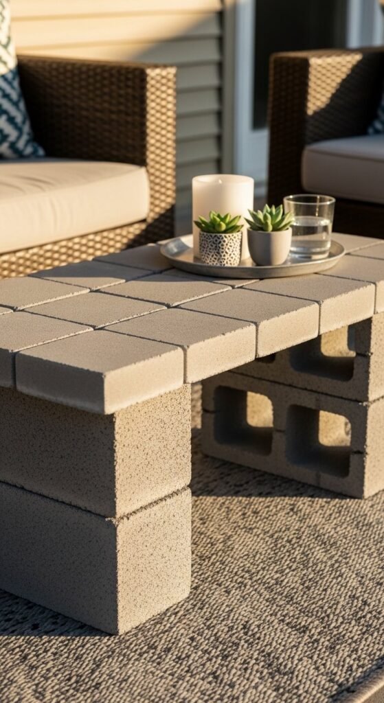 A concrete block and paver coffee table is one of the most budget-friendly outdoor furniture DIY projects available. Stack two cinder blocks at each end — four blocks total — and lay a smooth 24×48 inch concrete paver across the top. No adhesive or tools required. Total cost: about $15 to $25 depending on local material prices. The industrial concrete look pairs beautifully with wicker or teak furniture. Style the top with a tray, a candle, and a small plant. If you want a smoother finish, paint the blocks with concrete paint in white or charcoal. Disassemble and store easily at season’s end.