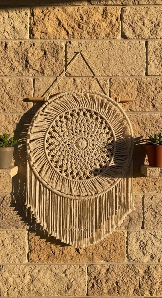 An exterior wall macramé or woven art piece brings the same warmth and texture to an outdoor wall that it would on an interior wall — without fading or weather damage if hung under a covered porch or pergola. Large round macramé hangings cost $30 to $60 on Etsy or at World Market. Hang from a single nail using the attached cord. Pair with two small potted succulents on narrow wall-mounted shelves at either side. The natural fiber and organic shape work with any outdoor style from modern farmhouse to coastal. This wall treatment transforms a blank exterior wall from a boundary into a styled backdrop.