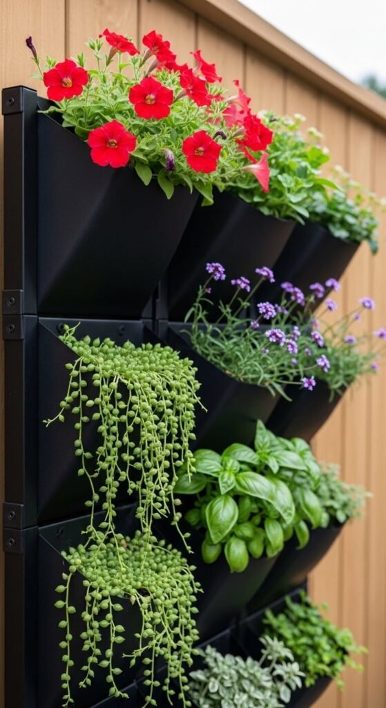 A vertical garden panel transforms a flat fence or wall into a living, textured feature wall that maximizes greenery in tight spaces. Modular vertical garden pocket systems cost $20 to $40 for a panel that holds 10 to 12 plants. Mount on a fence or exterior wall using screws. Fill pockets with a mix of trailing plants, compact flowering plants, and herbs. Water from the top and let it filter down through the pockets. This setup is especially effective on small patios and balconies where floor space is limited. A fully planted vertical panel dramatically changes the visual scale of a small outdoor area.