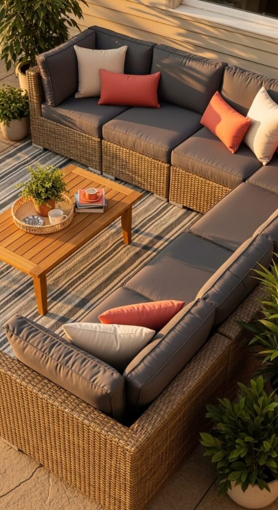 A deep-seated outdoor sectional is the furniture piece that most convincingly makes a patio feel like a living room. The deep seat depth — usually 25 to 30 inches — allows people to sit back rather than perch forward, which is what keeps them outside longer. All-weather wicker sectionals with cushions start around $300 to $600 for a full set. Look for sets that include a chaise piece — it becomes the most-used seat every single time. Position the sectional in an L-shape facing a fire pit, TV, or garden view so the arrangement has a natural focal point to orient toward.