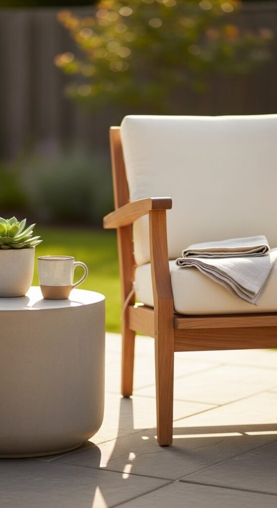 One side table per outdoor chair is the comfort detail that most patio setups get wrong by having too few surfaces for too many seats. Without somewhere to set a drink, book, or phone, guests balance things on chair arms or knees — which is uncomfortable and inconvenient. Small concrete or cast stone side tables cost $20 to $40 each. Round metal bistro tables work equally well at $15 to $25. Place one within easy reach of every seat. Matching tables create order. Mixing materials — concrete beside teak beside rattan — creates an organic, collected look that often feels more personal than a uniform set.