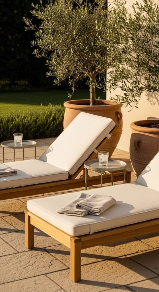 A pair of outdoor lounge chairs with side tables creates a dedicated relaxation zone that reads as intentional rather than leftover. Teak and powder-coated aluminum loungers start around $80 to $200 per chair. Place two side by side with a small table between them — not just beside one chair. The symmetry is what makes the setup feel designed. Aim the chairs toward a garden view, water feature, or fire pit rather than a fence. Add a small tray on each side table with a candle and a glass to make the setup feel like it’s ready to use the moment you walk outside.