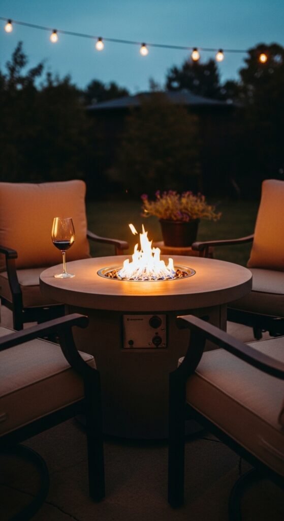 A fire pit at the center of a seating arrangement is the most socially magnetic patio feature you can add. People gravitate toward fire instinctively. A basic steel wood-burning fire pit costs $40 to $80 at hardware stores. Propane fire pit tables — which combine the fire feature with a usable table surface — start around $150 to $300 and are far easier to use on a paved patio than wood-burning options. Arrange seating close enough for conversation — 5 to 6 feet from the fire edge. Add a fire-safe side table for drinks and the entire patio setup revolves naturally around this one piece.