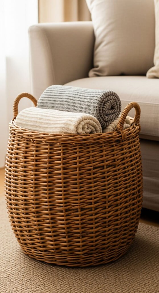 A large wicker floor basket solves the blanket storage problem while looking good doing it. Roll your throws and stack them inside — the texture of the weave and the soft folds of the fabric create an instant styled moment. No shelf or cabinet required. Look for baskets with sturdy bases and reinforced rims so they hold their shape over time. Natural rattan or water hyacinth options cost $30–$70 at home stores or online. Place one beside a sofa or armchair. It functions as storage and decor at the same time.