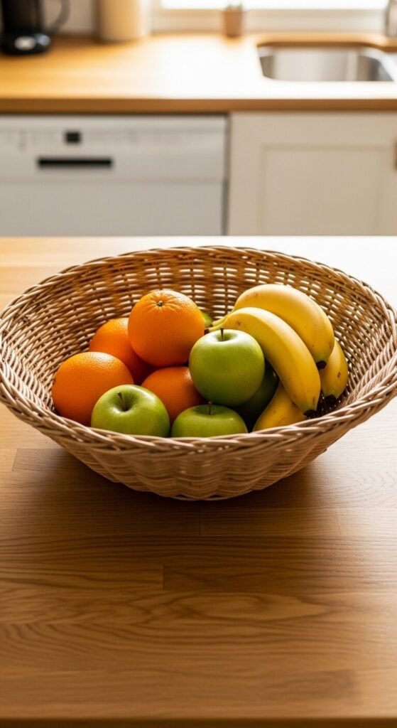 A wicker fruit bowl makes a kitchen counter look styled without any effort. The open weave allows air circulation, which is actually better for fruit than a solid bowl. Wide, shallow forms work best — they show the fruit well and are easy to reach into. Look for styles with a slightly raised base so the bowl sits cleanly on a counter surface. Natural rattan options cost $15–$35. This is one of the most affordable wicker decor items you can buy, and it earns its place on the counter every single day.