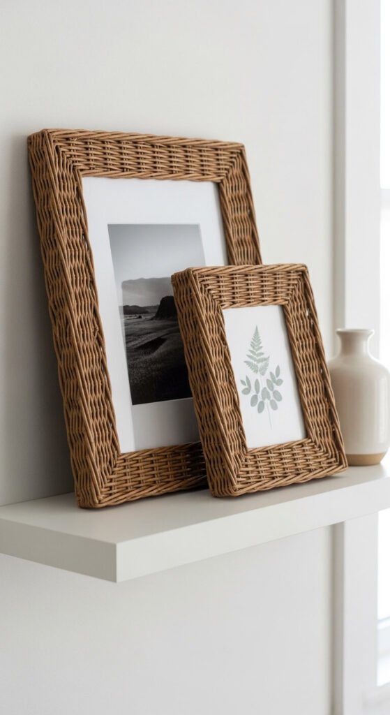 Wicker picture frames replace standard wooden or plastic frames with something that has actual texture and warmth. A wicker-framed photo sitting on a shelf or nightstand draws more attention than a plain painted frame. Look for frames with a flat, tightly woven rattan border — these show photos clearly without the frame competing with the image. Standard 4×6 and 5×7 rattan frames cost $15–$30 from craft stores and online retailers. Buy two in the same weave style to create a small paired display. Mix with ceramic objects for a shelf that feels thoughtfully assembled.