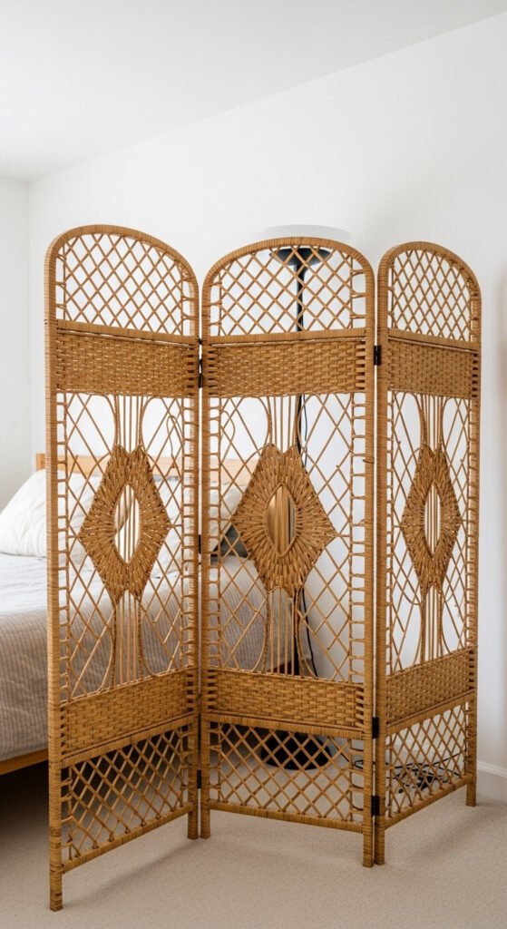 A wicker room divider creates separation in an open-plan space without blocking light or making the room feel smaller. The open weave allows air and light to pass through while still defining two distinct zones. Three-panel rattan screens in natural tones work well in studio apartments, open bedrooms, and large living rooms. They are also entirely movable — no installation required. Wicker room screens cost $60–$130 depending on height and weave density. Use one to separate a home office corner from a living area or to add a layer of texture to a plain wall.