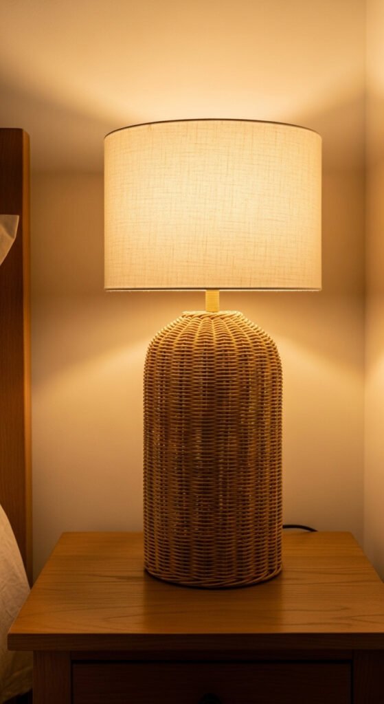 A wicker lamp base paired with a simple fabric shade makes a bedroom or living room feel warm and textured without competing with other decor. Rattan lamp bases come in cylindrical, gourd, and sculptural forms — all of them work well with linen, cotton, or paper shades in neutral tones. Look for bases with a solid internal structure so the shade sits level. Wicker lamp bases cost $40–$80 from home decor retailers. If you have an old ceramic lamp base, you can also wrap it in rope or rattan strips as a low-cost DIY alternative.