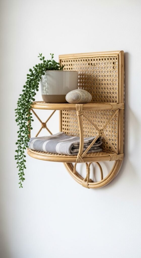 A wicker wall shelf adds storage and texture to a wall without the weight or bulk of a wooden shelf. Semicircular rattan shelves are a popular style — the curved front edge gives them a sculptural quality that flat shelves lack. Mount one in a bedroom, bathroom, or entryway for a small display surface. These hold lightweight items well: a small plant, a candle, a ceramic piece. Wicker wall shelves cost $25–$55. Use two at different heights for a layered wall display that feels considered but takes almost no time to set up.