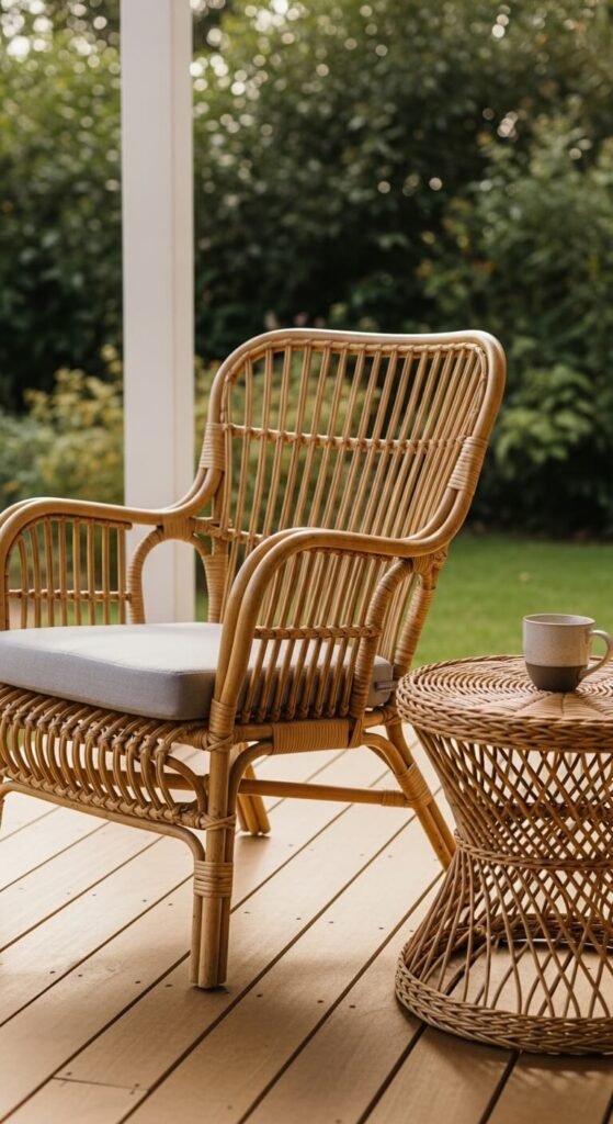 A wicker outdoor chair brings the warmth of natural texture to a porch, patio, or balcony. All-weather rattan or resin wicker handles outdoor conditions far better than natural rattan, so check the material before buying for exposed spaces. Look for chairs with wide armrests and a deep seat — comfort matters as much as appearance. A quality all-weather wicker armchair costs $80–$150. Add a weatherproof cushion in a solid neutral or simple stripe. A single wicker chair with a small side table creates a complete outdoor reading nook with minimal investment.