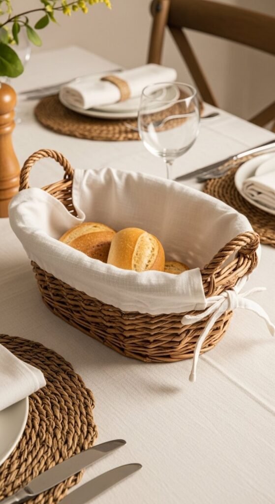 A wicker bread basket is a small, affordable detail that makes a dining table feel more considered. Line one with a cotton or linen cloth to keep bread warm and the presentation clean. Classic oval shapes in natural seagrass cost $12–$25. These also work as a fruit holder, a display piece, or a catch-all on a kitchen island. If you already own a plain wicker basket, a small linen liner transforms it instantly — cut a square of fabric to fit and fold down the edges. No sewing required.