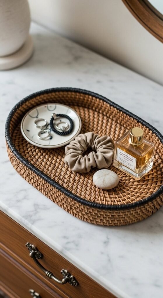 A small wicker tray on a dresser or nightstand keeps everyday items organized while adding texture to a flat surface. Use one for jewelry, keys, a perfume bottle, or a few meaningful objects. The shallow sides keep items contained without hiding them. Fine-weave seagrass and rattan trays in oval or round shapes cost $10–$25. This is one of the most affordable wicker pieces available. It also works on a bathroom counter to hold skincare items. One small tray can make an ordinary surface look styled with almost no effort.