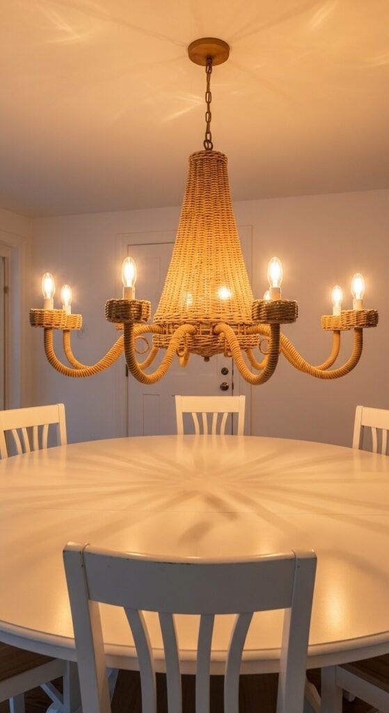 A wicker chandelier is the most dramatic wicker decor investment — and one of the most rewarding. Multi-arm rattan chandeliers with exposed bulbs have a sculptural quality that transforms a dining room or entryway. The natural tone of the wicker warms up white walls instantly. These require standard electrical wiring, so replacing an existing fixture is a manageable project. Wicker chandeliers cost $100–$250 for quality pieces. If that is outside budget, look for secondhand rattan light fixtures at thrift stores — they are common and easy to rewire with an electrician’s help.
