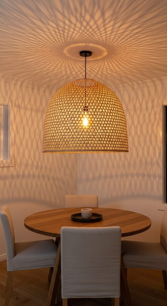 A wicker pendant light changes the entire character of a dining room or bedroom. The open weave casts shadow patterns across the ceiling and walls when lit — an effect that no solid shade can produce. Look for dome or bell shapes in natural rattan or bamboo. Standard pendant wiring fits most wicker shades, so swapping out an old fixture is a straightforward weekend project. Wicker pendant shades start at $40–$80. Pair with a warm-toned Edison or globe bulb. The combination of wicker texture and soft light creates atmosphere without extra decor.