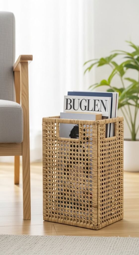 A wicker magazine or book holder keeps reading material accessible and off the coffee table without taking up much floor space. Tall, slim rectangular baskets work best — they hold items upright so spines are visible and retrieval is easy. Look for ones with reinforced sides that will not bow outward as the basket fills up. Natural rattan styles cost $20–$40. Place one beside a reading chair or sofa. It is a small organizational piece, but it keeps a living room looking tidy and adds a quiet texture detail to the corner where you spend the most time.