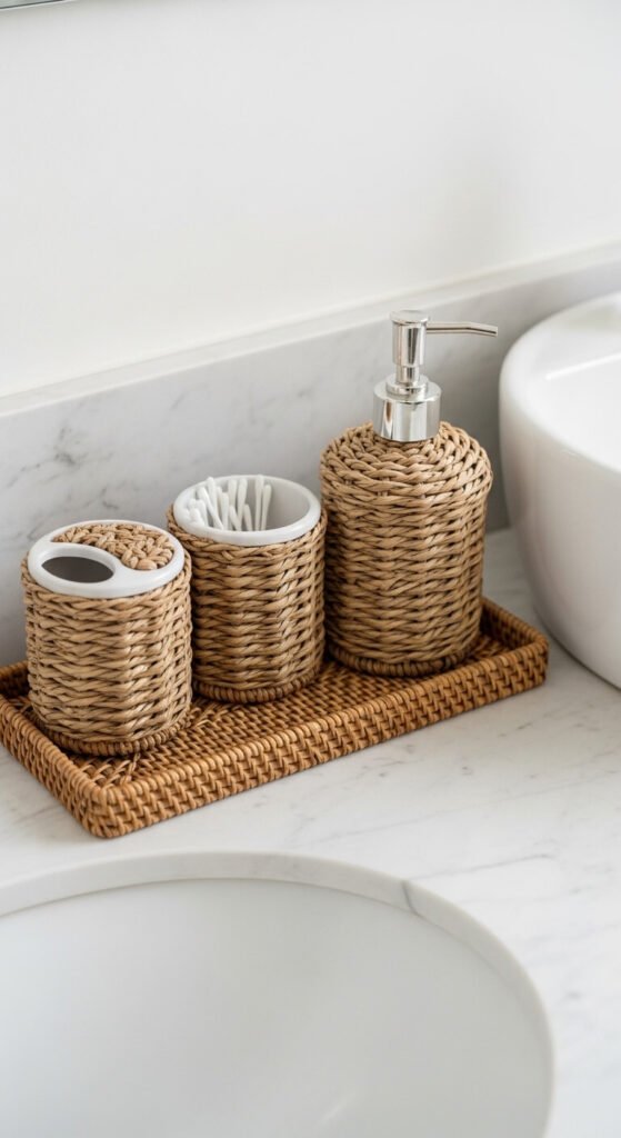 A wicker bathroom accessories set — a matched tray, cup holder, and dispenser wrap — makes a bathroom counter look cohesive and considered. The natural texture of the weave softens what is often a cold, hard-surfaced room. Look for sets in matching weave styles so the pieces feel intentional. Many sets come in seagrass or water hyacinth for $25–$50 as a complete bundle. If full sets are outside budget, buy a single wicker soap dish and tray to start. Even two matching pieces create the impression of a curated space.