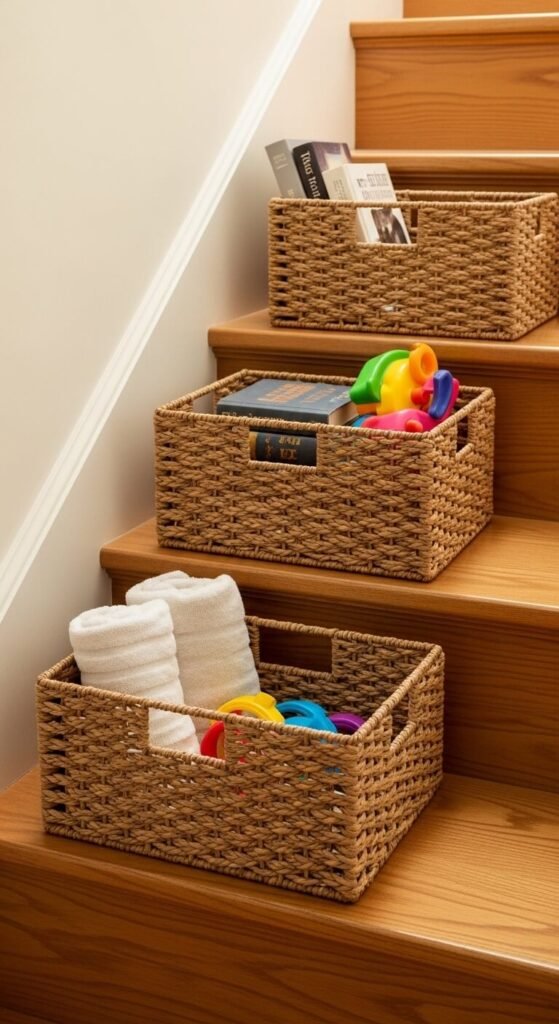 Wicker stair baskets are a practical and charming solution to the age-old problem of items waiting to go upstairs. A small set of three or four matching baskets, one per step, keeps things corralled and the staircase looking tidy rather than cluttered. Natural seagrass rectangular baskets cost $12–$20 each. The set as a whole costs under $60 and doubles as a small decorative detail in the stairwell. Use a consistent weave style across all the baskets. Matched baskets on a staircase look deliberate — mismatched ones look like clutter.