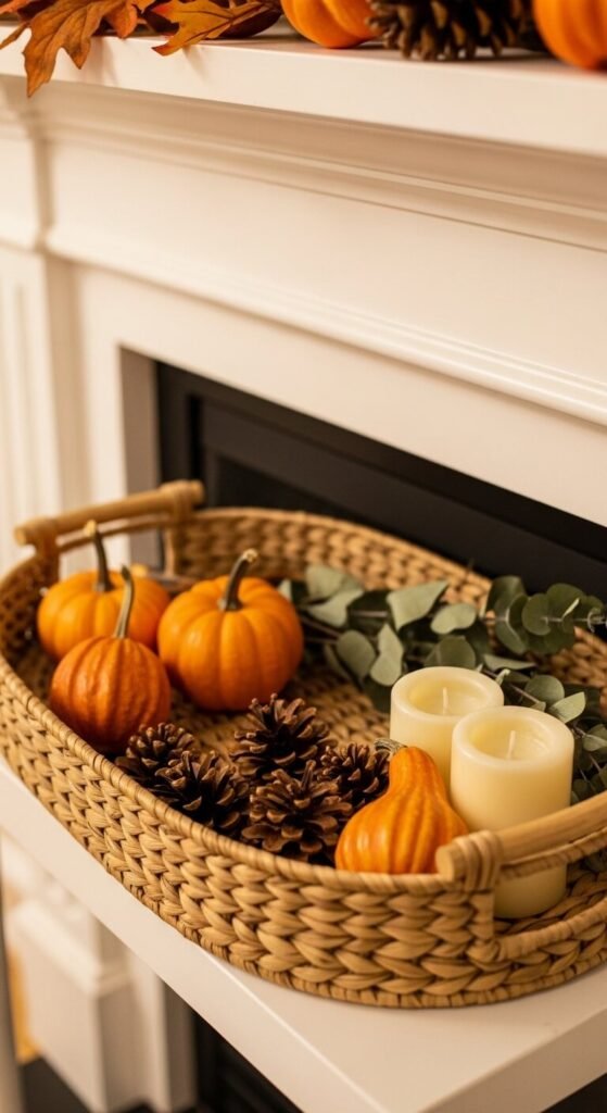 A large wicker tray or basket used as a seasonal display base is one of the most reusable decor investments you can make. The tray itself stays out year-round — only the objects inside change with the season. Fill it with dried botanicals and pumpkins in autumn, pine cones and candles in winter, and fresh branches or stones in spring and summer. A wide, shallow wicker tray costs $25–$45 and serves as the foundation for a mantelpiece or console table display through every season. The wicker grounds the arrangement and gives it a natural, organic quality.