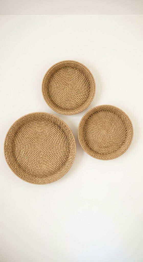 Wicker wall baskets arranged in a cluster function exactly like framed art — but with texture and dimension a flat print cannot match. Group three to five in varying sizes and hang them in a loose, organic arrangement. Round baskets work well in odd-numbered groupings. Natural seagrass and water hyacinth styles are widely available for $10–$30 each. Use standard picture hooks or Command strips for lightweight pieces. A gallery wall of wicker baskets on a plain white or warm greige wall is one of the most affordable statement walls you can create.