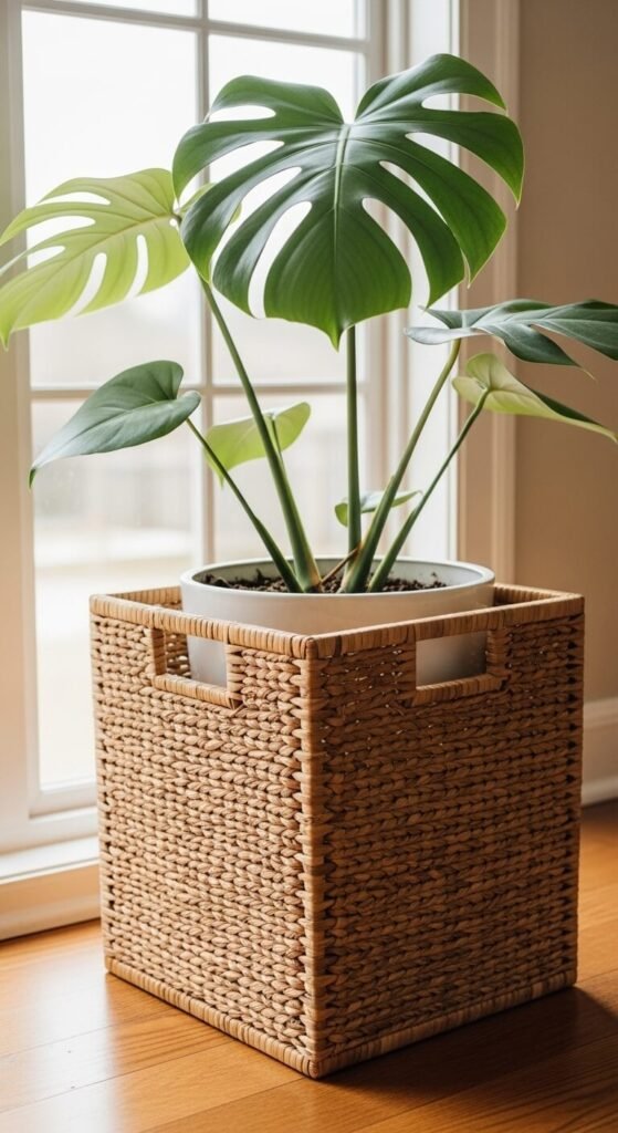 Wicker plant baskets are the simplest way to dress up a basic nursery pot. Drop your plant — pot and all — straight into the basket. No repotting required. Look for baskets just slightly wider than your pot at the rim so the plant sits snugly without tipping. Natural rattan and seagrass options come in every size, from small 6-inch baskets for succulents to large 14-inch versions for floor plants. Prices range from $10–$40. A wicker basket gives a plant more visual weight and ground it to the room.