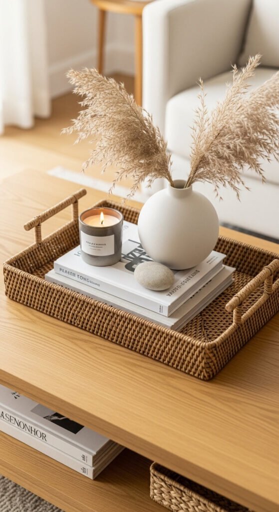 A wicker tray corrals coffee table objects without making the surface feel overly styled. The tray creates a boundary — items inside look intentional, items outside look random. Use one to hold a candle, a small plant, a stack of books, and one or two objects with interesting shapes. Wicker trays with a low rim and flat base work best on coffee tables. Look for ones with a reinforced border for structure. These cost $20–$45 at most home decor retailers. They also work on ottomans, bathroom counters, and kitchen islands.