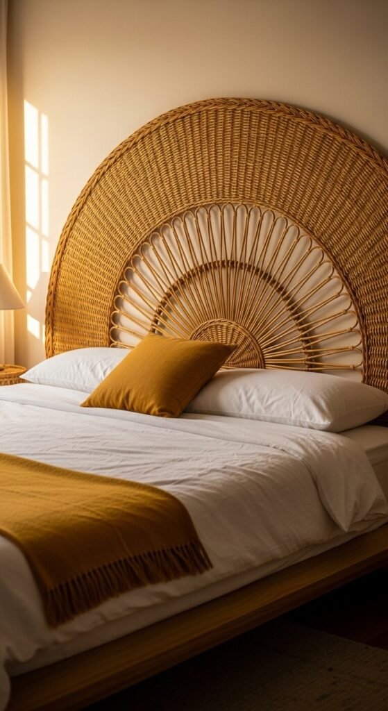 A wicker or rattan headboard makes a bedroom feel warm and collected without requiring any additional wall decor. The texture and shape of the piece do the work on their own. Fan-shaped and arched rattan headboards in particular have a sculptural quality that works in boho, coastal, and even minimal interiors. Many come as freestanding pieces that lean against the wall — no drilling required. Prices range from $80–$200 for queen sizes. Pair with white or neutral linen for a clean contrast that lets the wicker texture read clearly.