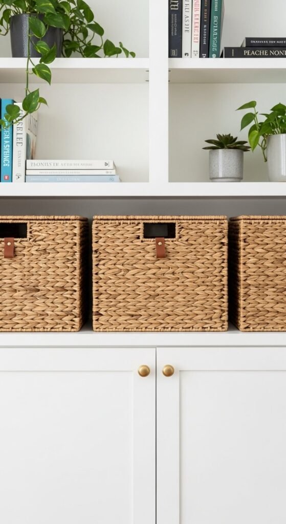 Wicker storage bins make open shelving look organized without requiring matching boxes or baskets. Slide them into shelf openings to hide toys, remotes, craft supplies, or folded linens. The wicker texture adds warmth to what could otherwise be a cold, utilitarian shelf. Look for rectangular bins with leather or rope pull tabs — these make retrieval easy and add a small detail worth noticing. Wicker shelf bins cost $15–$35 each at most home stores. Buy two or three in the same style to create a consistent look across a shelving unit.