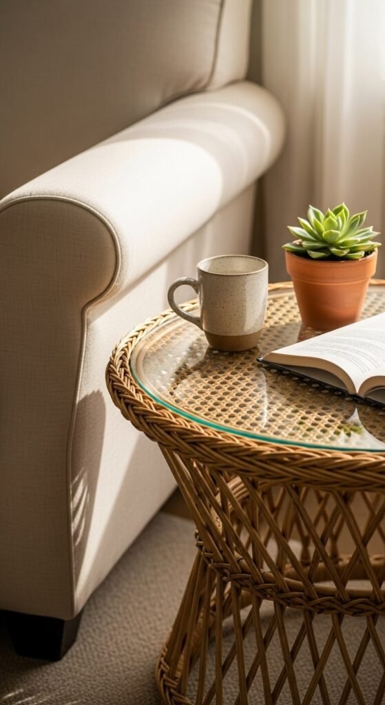A wicker side table brings natural texture to a seating area at a price that is hard to match. Round rattan side tables with glass or wooden tops are widely available for $50–$120. The glass top makes the surface practical — you can set drinks without worrying about marking the weave. Use one beside a reading chair or sofa to replace a generic end table. The organic shape and wicker texture make the corner feel warmer and more considered. These work equally well indoors and in covered outdoor spaces.