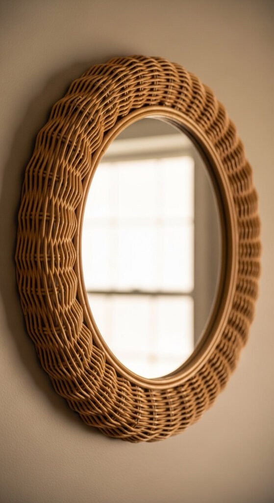 A wicker-framed mirror adds texture to a wall in a way that a painted wood frame simply cannot. Round rattan mirrors are among the most searched home decor items right now, and for good reason — they work in almost any room. Hang one in a bedroom, entryway, or living room. The frame does the decorating. You do not need anything else on that wall. Round wicker mirrors 24–30 inches in diameter cost $40–$90. For a more dramatic look, go larger — a 36-inch rattan mirror becomes a genuine focal point.